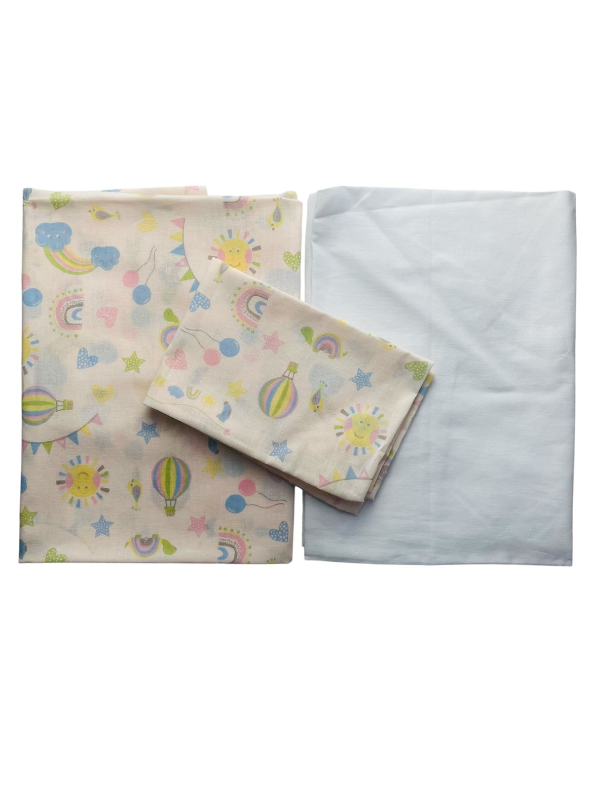 Medidas: 1 lençol com elástico medindo 1,30m x 60 cm x 10 cm, 1 virol medindo 1,50mx90cm e 1 fronha medindo 40 x 28cm