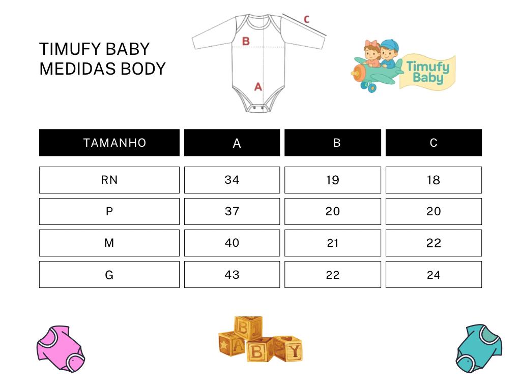 Tamanhos Variados: Este body está disponível em uma variedade de tamanhos, desde recém-nascidos até bebês maiores, (RN ao G) garantindo um ajuste perfeito à medida que o seu pequeno cresce.