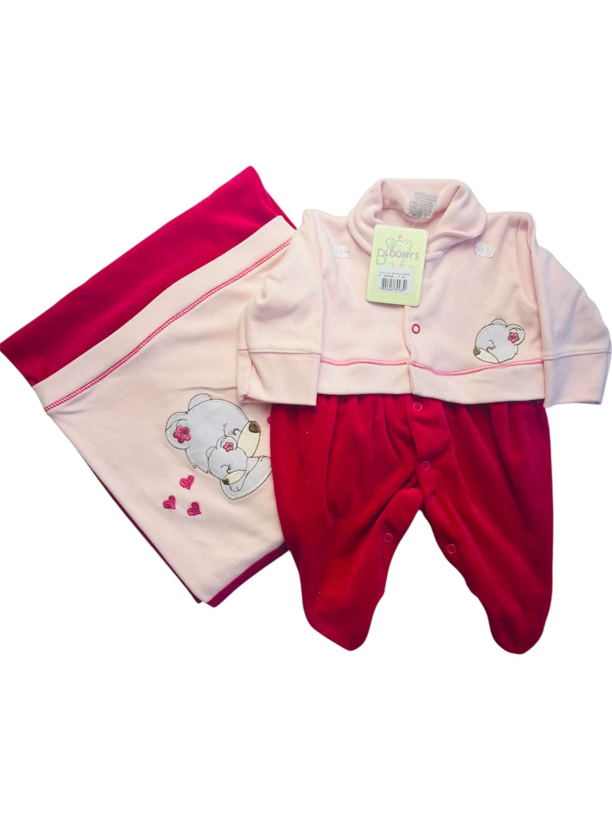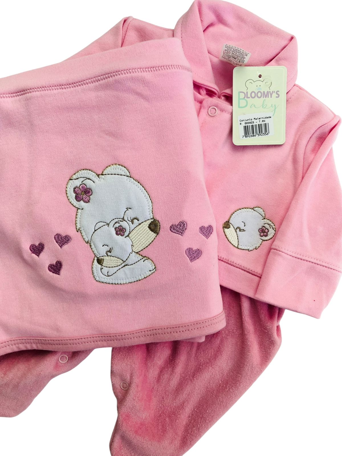 SAÍDA DE MATERNIDADE 2 PÇS MANTA E MACACÃO LONGO PLUSH E SUEDINE BORDADO FEMININO